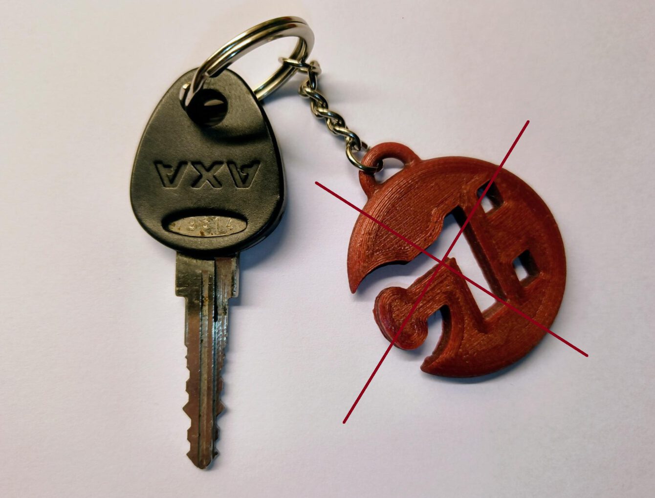 Voor ik het vergeet: de sleutelhanger houd ik wel graag zelf. Het kettinkje slijp jij waarschijnlijk ter plaatse wel door. Je kunt natuurlijk altijd nog het restant van mijn kettingslot eraan maken, toch?!
