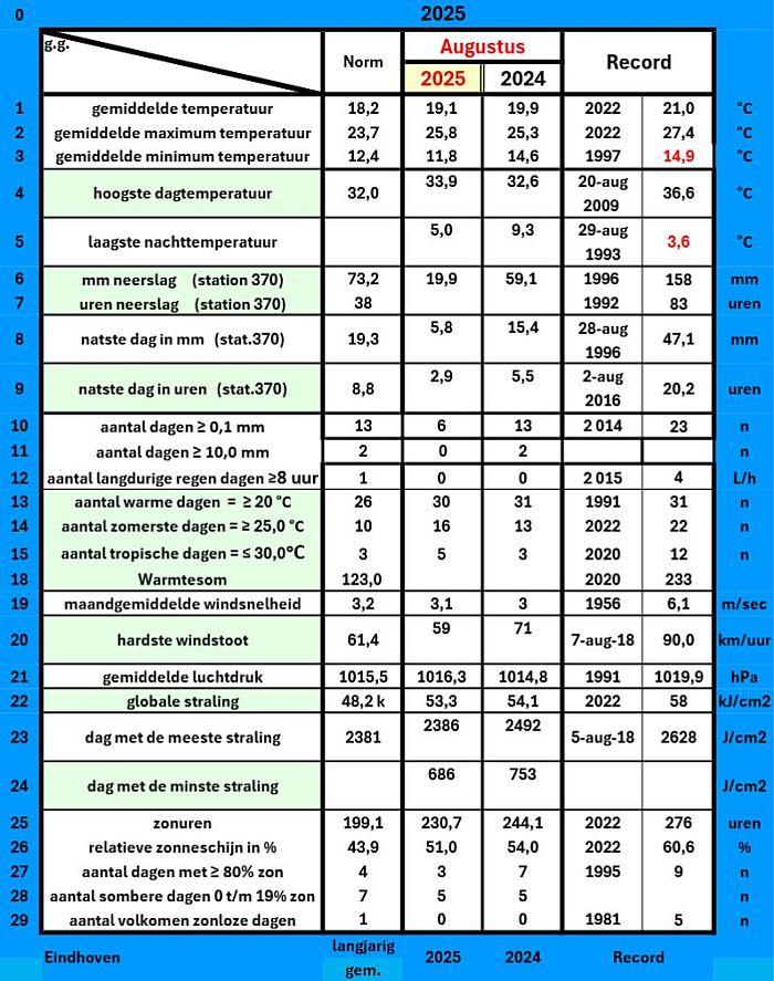 Weerhistorie: het weer van augustus 2025 in de regio Eindhoven.