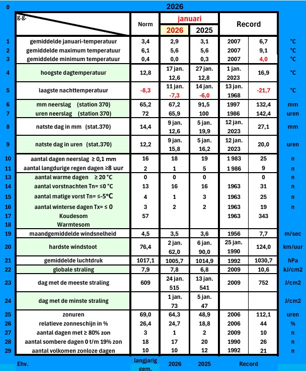 Met een gemiddelde van 2,9 graden was januari 0,5 graad te koud. Januari 2025 was ook al 0,3 graad te koud. De eerste 11 dagen van de maand waren winters met een gemiddelde temperatuur van 0,1 graden. Op de 11e werd de laagste temperatuur van de maand gemeten: – 7,3 graden (op 1,5 meter hoogte). Aan de grond vroor het die ochtend -10,1 graden. Op 17 januari werd het met 12,6 graden het warmst; een dagrecord.