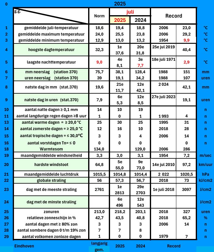Het was even spannend of juli 2025 zonniger dan normaal zou worden, maar dankzij een vrij zonnige 30 juli is het gelukt. Juli was de 6e te zonnige maand op rij in 2025. Nu 218,2 uren zon tegen 213,2 uren normaal. Er waren maar drie uitgesproken zonnige dagen en op een dag scheen de zon slechts 0,2 uur (6 juli). Het aantal uren zonneschijn is van januari tot en met juli erg hoog: 1369 uur tegen 1126 uur normaal. Het is nu al bijna zeker dat 2025 een zonnig jaar wordt.