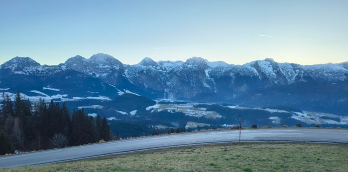 Omdat we na een uurtje toch last kregen van koude voetjes, besloten we via een bekende sluip-door-kruipdoorroute weer richting Wolfgangsee te slingeren. De Postalm, een tolroute helaas, is een verplichte traktatie voor wie in dit gedeelte van Oostenrijk verblijft. Op weg naar het tolpoortje kwamen we al serpentinerend in de stemming omdat mijn lief ‘per ongeluk’ schlagermuziek van Duitse aard op de radio had gevonden. Het uitzicht werd er niet minder om.