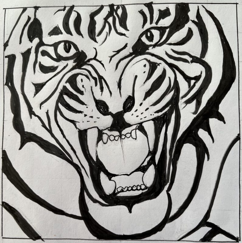 En dan nu de beloofde tijger. Voor deze tekening heb ik eerst een oefening gemaakt in zwart-wit om gevoel te krijgen voor de strepen. Was dus voorbereidend werk maar kleinzoontje vond hem heel stoer dus nu zit er een lijstje om en komt ie op zijn kamer te hangen.