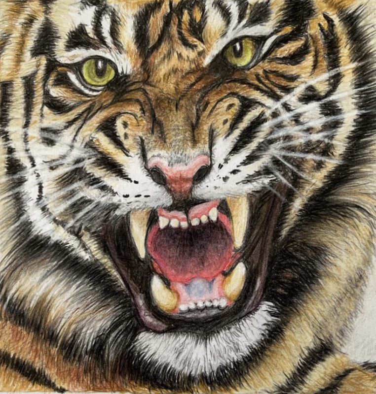 Daarna kwam het echte werk in kleurpotlood. Zoals altijd denk ik dan de eerste uren: waar ben ik aan begonnen! Maar gaandeweg gaat het ergens op lijken. Waar ik niet tevreden over ben dat zijn de snorharen. In tegenstelling tot verf kun je met kleurpotloden niet met lichte kleuren over donkere. Dus óf je moet die witte haren uitsparen (vind ik niet te doen) óf je maakt ze later met een heel fijn gummetje of met een pen met witte inkt. Van die laatste heb ik nog steeds geen goed exemplaar gevonden (tips?). Dus ik laat het maar even zo. Verder ben ik tevreden over het resultaat.