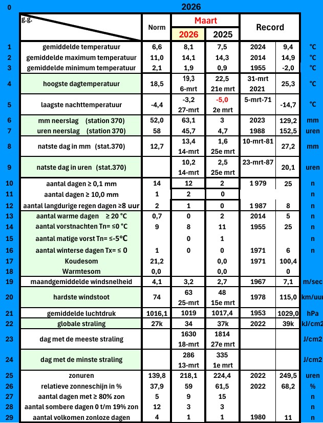 - 6 maart: 19,3 (de hoogte temperatuur van de maand).