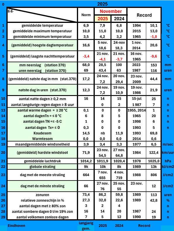 Er viel in Eindhoven duidelijk minder neerslag dan normaal. 28,5 millimeter tegen 67,3 normaal. Net als in oktober was Eindhoven ook deze maand het droogste knmi hoofdstation. December moet wel heel erg nat worden wil Eindhoven niet uitkomen op een veel te droog jaar. De natste dag was de 24e met 7,2 millimeter. Er waren 18 dagen met 0,2 mm neerslag of minder. Op 23 november viel er in de vroege ochtend wat sneeuw.