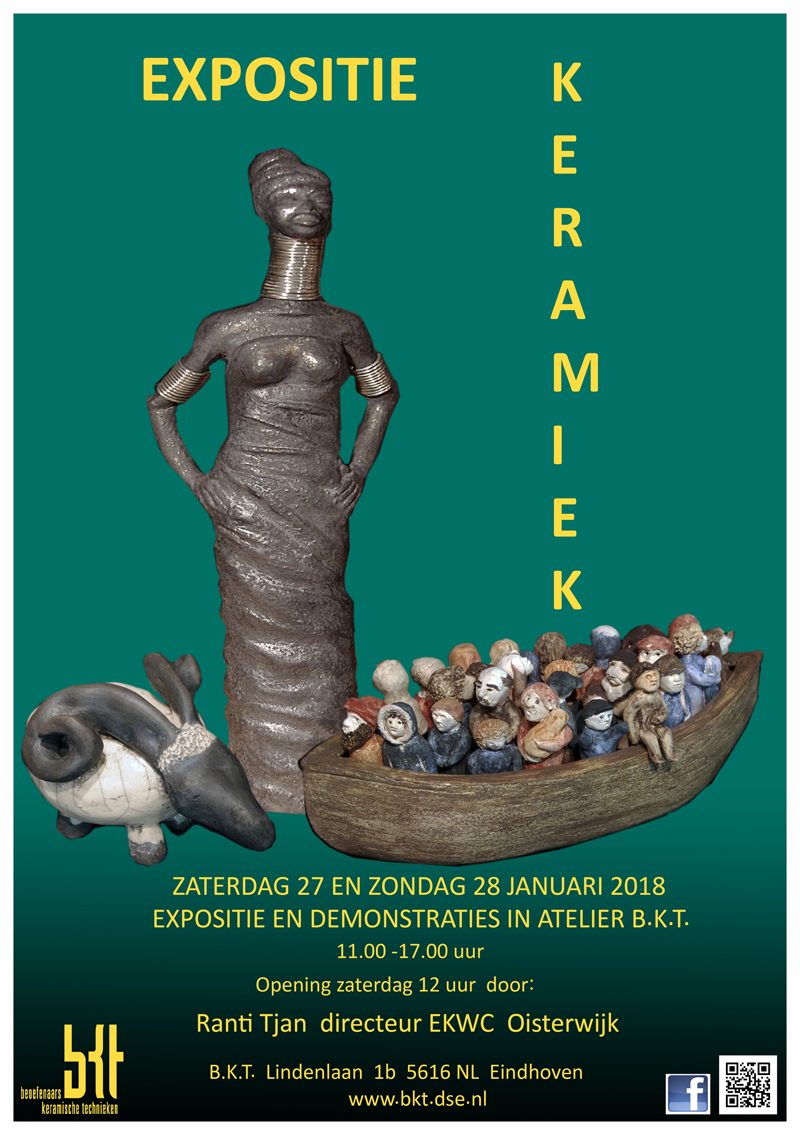 In het weekend van 27 en 28 januari 2018 houdt de vereniging Beoefenaars Keramische Technieken (BKT) de jaarlijkse overzicht tentoonstelling in haar Atelier aan de Lindenlaan 1b 5616 NL te Eindhoven.