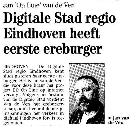 Op maandag 17 februari 2003 werd de gemoderniseerde Digitale Stad Eindhoven “www.dse.nl” heropend door de heer Rein Welschen, burgemeester van…Read More In de jaren 2001 en 2002 verzorgt de Digitale Stad Eindhoven masterclasses voor basisschoolleerlingen met het doel hun ICT-vaardigheid te…Read More In oktober 2001 stond de DSE op de Zuid Nederlandse Beurs. Uit een interview met bestuurslid Wim Hendriksen: “De Digitale…Read More In 2000 kreeg de DSE een nieuw uiterlijk. Jarenlang was de gele kleur terug te vinden in alle publicaties. Ben Waumans was voorzitter van DSE vanaf 1 januari 1997 tot het einde van zijn leven op 11 november 2009.…Read More Op 16 januari 1995 werd de DSE gepresenteerd door mede-oprichter en eerste voorzitter Egbert-Jan Sol. (Citaat: “PTT verkoopt tegenwoordig zelfs…Read MoreDigitale Stad Eindhoven