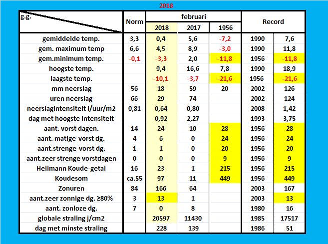In de tabel vergelijk ik februari 2018 (Eindhoven) met 2017 . Ook heb ik wat cijfers meegenomen van de extreem koude februarimaand 1956.