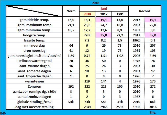 In onderstaande tabel heb ik de cijfers voor juni 2018 in Eindhoven opgenomen naast de cijfers van verleden jaar. Een goed vergelijk met de warmste juni-maand is zo dus mogelijk. Ook juni 1991 heb ik in de tabel meegenomen. Dat was geen al te beste maand en dus steken de cijfers van de 2 laatste jaren hier flink bij af.