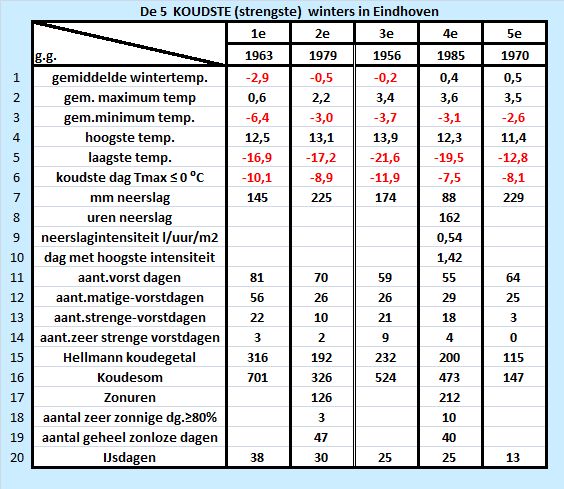 Zowel Jan Buisman als Jacob Kuiper e.a. vinden de winter van 1963 de strengste winter van de 20e eeuw. Ik moet het daar wel mee eens zijn want ook uit de rangschikking uit mijn database komt 1963 als strengste winter naar voren, ook in Eindhoven. In sommige publicaties wordt 1956 als strengste winter van de vorige eeuw genoemd. Dat lijkt mij niet juist want in deze winter waren december en januari zeer zacht en alleen februari koud. Zeer koud zelfs want met een maandgemiddelde van -7,2 is februari 1956 met afstand de koudste februarimaand. In mijn rangschikking staat deze winter op plaats 3. De laagste temperatuur in deze winter is met -21,6 voor Eindhoven net geen record(regel 5 uit de tabel).
