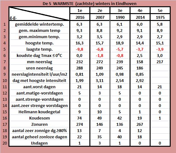 Van de zachte winters zijn de winters van 2016 en 2007 het warmst. Het vriest in die winters nauwelijks . In 2016 was er wel veel zon in de winter(regel 17 v.d. tabel). Dat geeft samen met een hogere temperatuur een aangenaam gevoel.